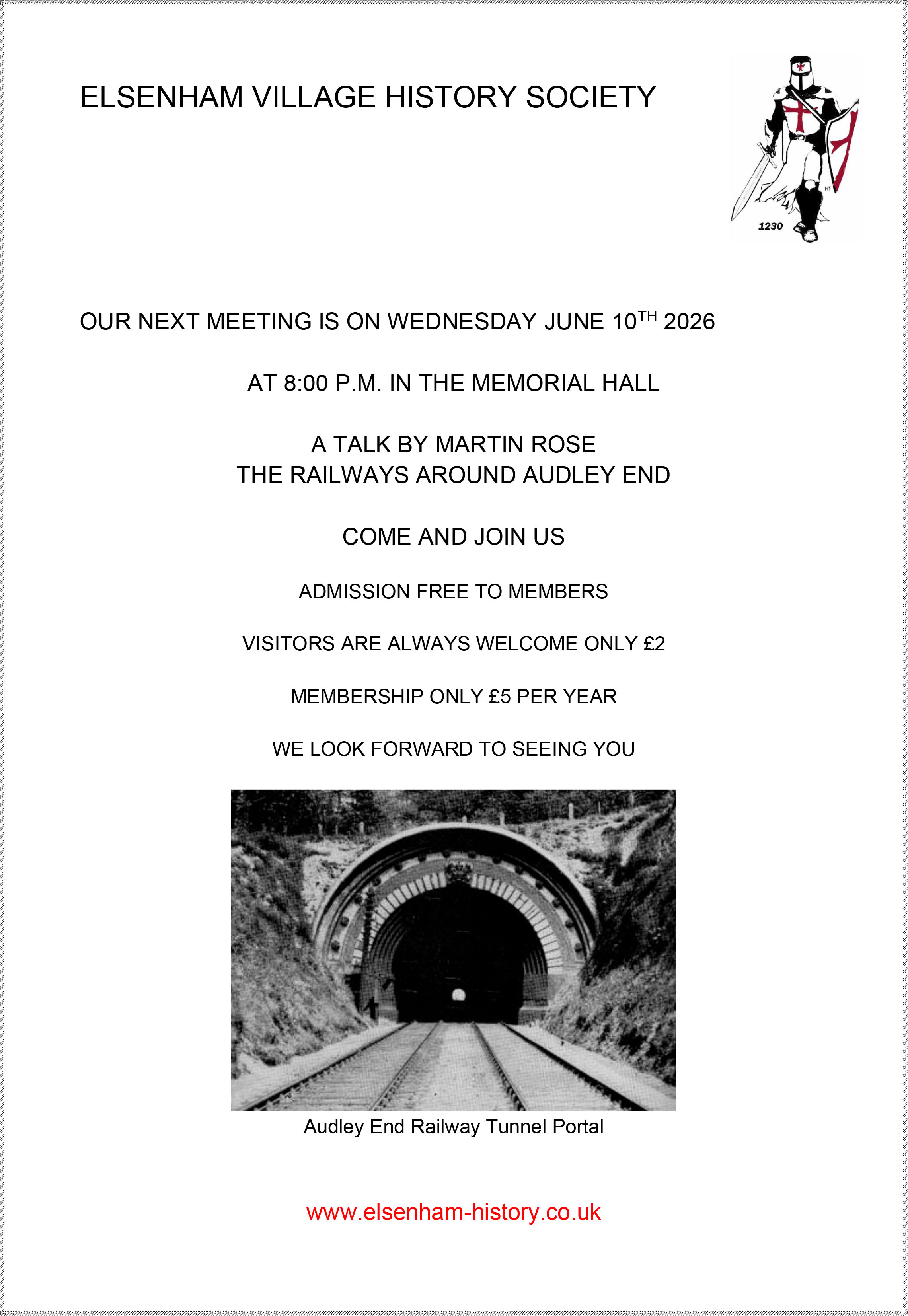 Speakers have included: the former Managing Director of the Elsenham Jam Factory; a talk by a local author on his life as a locomotive driver; a local historian on the architecture of Thaxted; the history of the Elsenham to Thaxted branch line; notable architecture and history of Saffron Walden; the history of Easton Lodge and the five parishes; notable cases from the history of Essex Police; the Audley End to Saffron Walden Branch line; Researching Your Family Tree by a local practitioner.